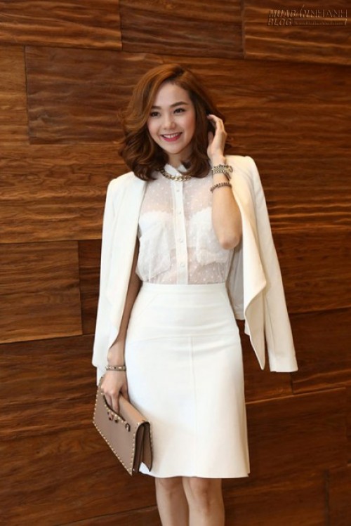 Bộ váy áo theo xu hướng white-on-white kết hợp cùng ví cầm tay Valentino đính đá tạo nên sự thanh lịch, trẻ trung mà vẫn không kém phần sang trọng cho người đẹp.