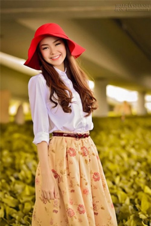 Ngược lại với sự gợi cảm, quý phái là một Minh Hằng nhẹ nhàng, trong sáng với mái tóc xoăn đuôi và chân váy hoa dài mix áo sơmi trắng trẻ trung.