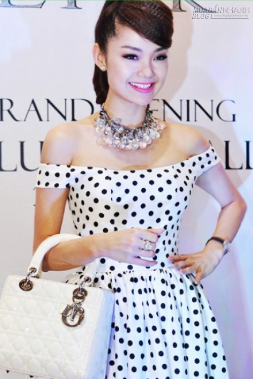 Váy họa tiết chấm bi trắng xòe với mái tóc dập xù buộc cao làm Minh Hằng vừa trẻ trung lại vẫn giữ được sự sang trọng và quyến rũ vốn có của mình.
