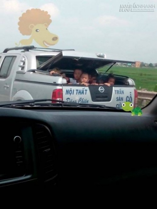 Phải chăng trong xe quá chật chội và nóng bức, nên các em nhỏ được ngồi sau xe hóng mát cho "thiên nhiên".