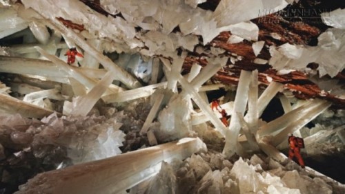 Mẹ thiên nhiên đã giấu đi những mỏm pha lê lớn nhất thế giới dưới độ sâu gần 300m trong núi Naica, miền tây bắc Chihuahua, Mexico. Hang động đã cạn nước từ 1975 nhưng phải đến năm 2000 những người thợ mỏ mới tìm thấy những khối pha lê thạch anh trắng sữa dài giống như cột cờ này. Dù nhìn có vẻ băng giá, nhưng những tinh thể pha lê khổng lồ này đã được “luyện” trong nhiệt độ cao tới 50 độ C và được tích tụ trong môi trường nước giàu khoáng chất suốt khoảng thời gian 500000 năm. Các nhà nghiên cứu chỉ có thể vào hang trong một khoảng thời gian ngắn, sau đó phải có kế hoạch làm ngập hang trở lại để bảo tồn những tinh thể pha lê này.