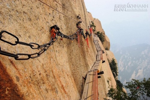 Đường đi cực nhỏ, hẹp với dây xích để bám. Bên cạnh là dốc thẳng đứng của núi Hoa Sơn, Trung Quốc. Đi trên cây cầu này cân sự bình tĩnh và lòng can đảm ghê gớm