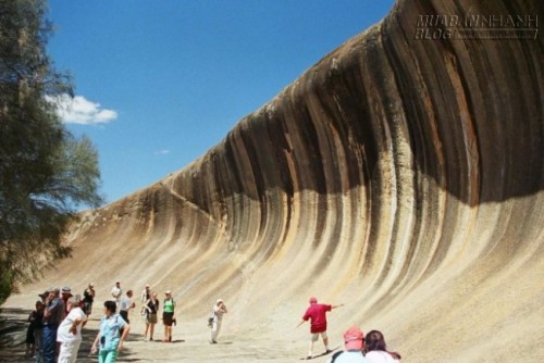 * Wave Rock, sóng thần… bằng đá cách thành phố Perth bang Tây Úc khoảng 340km. Sự xói mòn của gió và nước trên tảng đá hoa cương cao 15m và dài khoảng 110m trong hơn 60 triệu năm khiến nơi đây giống như làn sóng đá khổng lồ vươn lên giữa sa mạc.