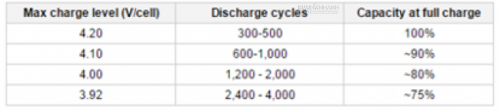 Trong trường hợp sạc với điện áp thấp hơn (4,1V), pin sẽ đạt được 600 - 1.000 chu kỳ sử dụng nhưng hiệu suất chỉ đạt 90%.