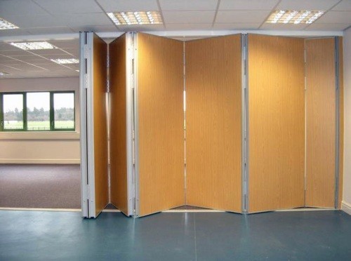 Việc thay thế tường bằng vách ngăn di động chính là giải pháp tuyệt vời nhất. Bạn sử dụng vách ngăn di động để chia nhỏ các phòng. Khi muốn có phòng lớn hơn cho hội họp thì chỉ cần xếp vách gọn lại.