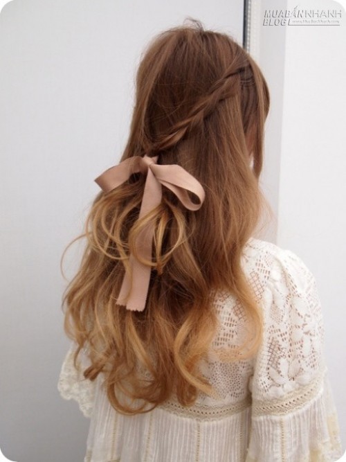 Lấy 2 lọn tóc trên phần tóc mái tết rồi cột lại với nhau là bạn đã có ngay kiểu tóc tiểu thư rồi. Thêm nơ hay phụ kiện cho mái tóc thêm lung linh nhé!