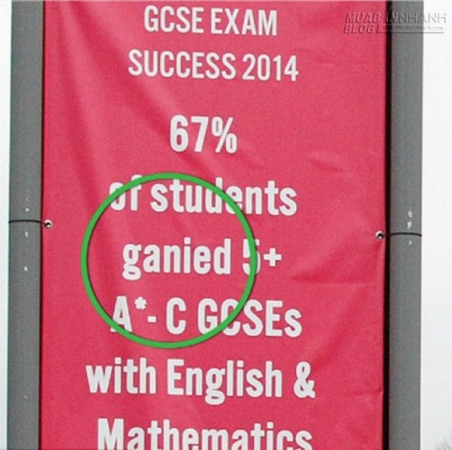 Trường trung học phổ thông này đang muốn giới thiệu: "67% học sinh đạt điểm A+ trong kỳ thi GSCE cho môn Toán và môn tiếng Anh". Tuy nhiên, chữ "gain" bị viết nhầm thành "gani" nên ngôi trường có lẽ đã không thành công với nỗ lực quảng cáo này.