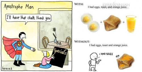 Câu trên có nghĩa: "Tôi ăn trứng, ăn bánh mì và uống nước cam" còn câu dưới có nghĩa "Tôi ăn một cái bánh mì kẹp trứng được nhúng nước cam". Dấu phẩy đã cho thấy chức năng quan trọng trong việc diễn đạt chính xác.