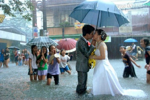 Không chỉ ở Việt Nam mà nhiều nơi khác trên thế giới cũng gặp cảnh "cưới trong mưa lũ". Đây là hình ảnh cặp đôi Ramoncito Campo và Hernelie Ruazol Campo hôn nhau trong ngày cưới bất chấp đợt mưa lớn hoành hành tại thủ đô Manila, Philippines năm 2012. |