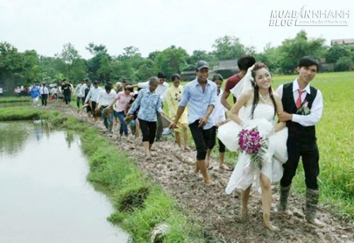 Mưa khiến con đường nhỏ trở nên lầy lội nên cô dâu quyết định lội bùn "theo chàng về dinh". Đoàn rước dâu tay cầm dép, tay túm quần áo nhưng ai cũng tươi cười. |