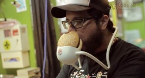 5. Một anh chàng bận rộn không có thời gian cầm bánh, nhưng đói quá rồi phải làm sao đây?