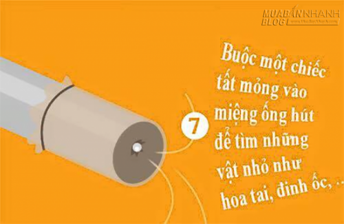 Để tìm những vật nhỏ mà không tốn thời gian, hãy buộc một chiếc tất mỏng vào đầu ống hút bụi, chúng sẽ bám trên đó mà không trôi đi đâu cả.