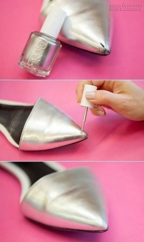 Sơn một ít sơn móng tay không màu lên phần mũi đôi giày của bạn để làm mờ các vết trầy xước