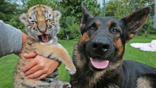 Biểu cảm đáng yêu của chú hổ con 2 tuần tuổi tại Senec, Slovakia. Chú đã bị tách khỏi mẹ, và một nhóm tình nguyện viên, trong đó có chú chó nằm bên cạnh, nhận lãnh nhiệm vụ chăm sóc chú. (Ảnh: CNN)