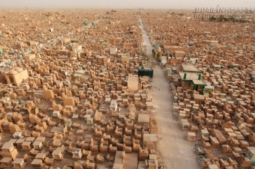 Với những người không tin vào thế giới tâm linh thì việc sống cạnh nghĩa trang khá lý tưởng, yên tĩnh. Nhưng với những người sợ ma thì sống tại Najaf, Iraq đúng là một cơn ác mộng. Thành phố này có Wadi Al-Salam, nghĩa trang lớn nhất thế giới, nơi an nghỉ của hơn 5 triệu người. Việc chôn cất diễn ra hàng ngày trong suốt 1.400 năm qua. Để có một suất đất trong nghĩa trang, người ta phải chi tới 10.000 USD.