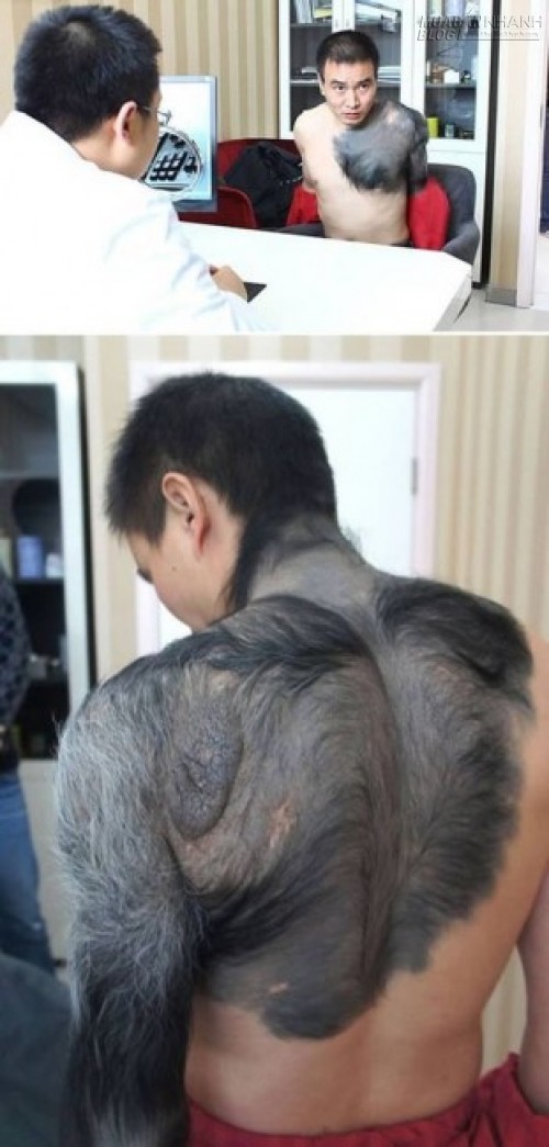 Chàng trai có tên Zhang Hongming sống tại Trùng Khánh , phía đông nam Trung Quốc, được gọi với biệt danh là "Tinh tinh ". Thoạt nhìn, cơ thể người đàn ông này có vẻ như " nửa người nửa sói" , nhưng nhìn kỹ và bạn sẽ thấy đó thực sự là một cái bớt đầy tóc. Được biết chỉ có khoảng 3 phần trăm dân số thế giới sở hữu vết bớt "quái dị" này.