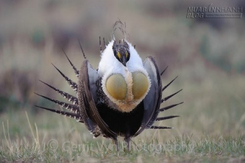 Chim Greater Sage-Grouse. Loài chim này có bộ lông nhọn, nhiều màu sắc. Chúng nổi tiếng nhất khu vực Bắc Mỹ với điệu múa ấn tượng. Nó là loài chim nổi tiếng về điệu múa. Vào mùa sinh sản, hàng chục chim trống xòe đuôi dài đồng thời bật túi khí màu vàng trên ngực để tạo ra âm thanh đặc biệt. Âm thanh có thể nghe được dù cách xa 2 dặm.