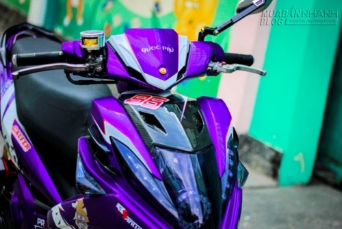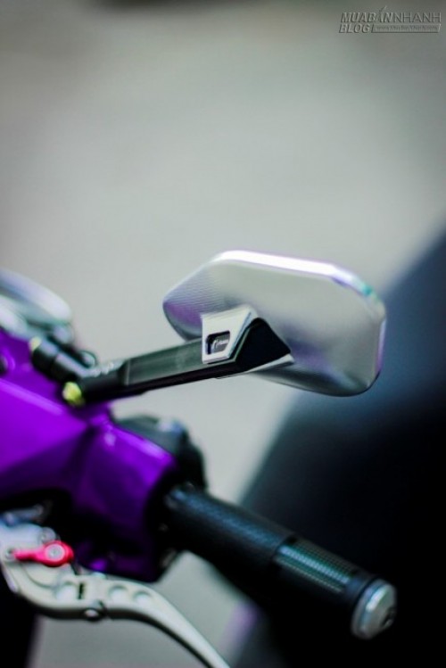 Đầu tiên là toàn bộ dàn áo được sơn airbrush màu tím than khá bắt mắt. Phía trước được trang trí một số món đồ chơi như pat dây dầu Rizoma, thắng đĩa răng cưa...