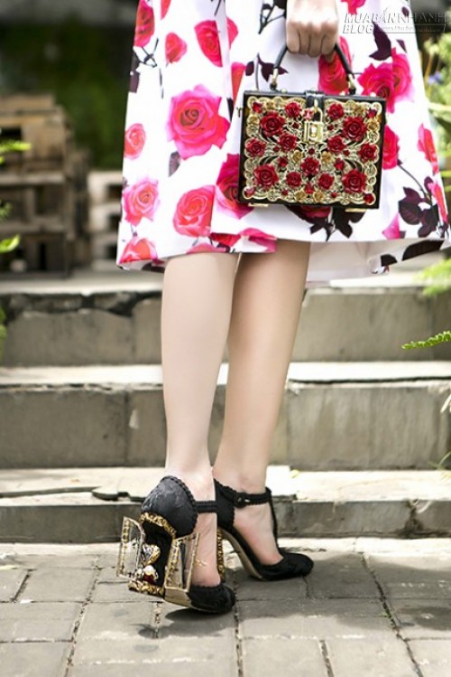 Cô chọn túi xách và giày cao gót của thương hiệu D&G làm phụ kiện. Thiết kế phụ kiện này khá cầu kỳ với họa tiết ánh kim được chạm khắc tinh xảo.
