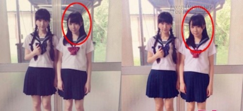 Cô bé đứng bên phải với chiếc nơ đỏ có tên Yamazaki Eri bỗng trở thành nạn nhân của cư dân mạng một cách bất đắc dĩ khi sự khác biệt giữa 2 bức ảnh quá rõ ràng. Nhược điểm duy nhất của Eri chính là chiếc đầu hơi quá khổ và khuôn mặt bầu bĩnh, để khắc phục chúng cô nàng đã dùng ứng dụng chỉnh sửa để bóp nhỏ khuôn mặt. Thế nhưng thật không ngờ, một điểm khác biệt duy nhất này cũng bị cư dân mạng phũ phàng bóc mẽ.