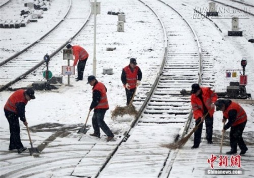 Công nhân đường sắt ở Giang Tây quét dọn tuyết chờ đoàn tàu vào ga.