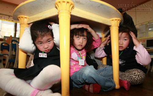 Trẻ được dạy cách nấp dưới bàn khi nghe có thông báo động đất.