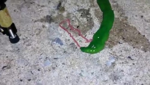 Trang Dailymail mới đây đăng tải một video về sự xuất hiện của sinh vật màu xanh bí ẩn tại Đài Loan. Được biết, sinh vật màu xanh bí ẩn này có màu xanh lá cây đang bò trên sàn bê-tông và dùng chiếc lưỡi dài với chất dịch nhờn của mình để tìm kiếm con mồi.