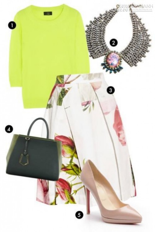 Một chiếc chân váy xòe tinh tế trông vẫn thật trẻ trung khi được kết hợp với phần thân trên là màu neon và một vòng cổ cá tính. Hoàn tất outfit của bạn bằng một chiếc túi to đủ để bạn nhồi nhét hàng đống giấy tờ như danh sách khách mời, sơ đồ chỗ ngồi và nhiều thứ khác nữa.
