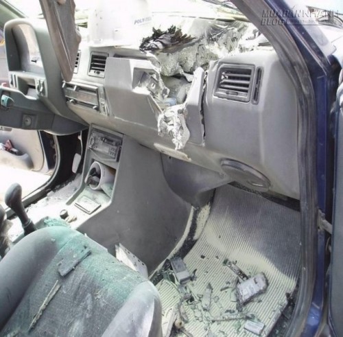 Pin điện thoại phát nổ khi để trong hộc đồ trước táp lô xe đã phát nát nội thất chiếc xe ôtô. (ảnh: eedero.com)