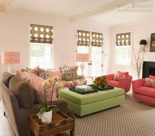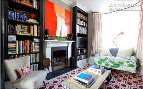 Bí quyết ở đây là cần có một màu nhạt làm nền, đỏ, nâu hoặc xanh nhạt- và sử dụng những mảng lớn màu đồng (ghế sofa màu nâu, ghế màu đỏ, màu xanh lá cây và xanh) để dìm màu cho không gian.