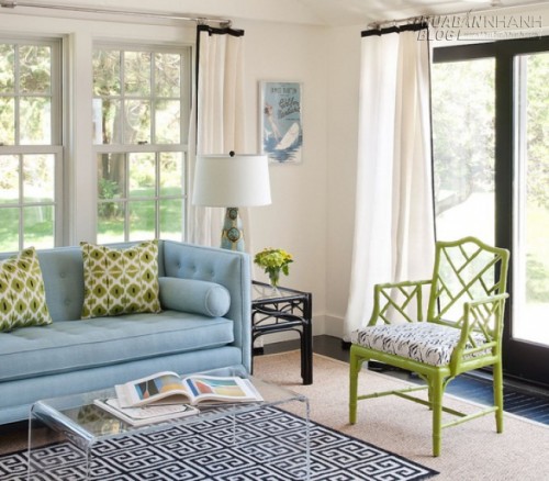 Tạo nên một xu hướng mới cho truyền thống, sử dụng vài chiếc ghế cổ điển kết hợp vẻ hiện đại của ghế sofa và bàn trà kính với màu xanh nước biển và màu xanh lá cây với tông màu bão hòa.