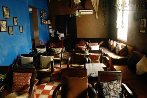 Quán chỉ có hai gian với cách trang trí tương đối giống nhau. Tuy nhiên, bạn vẫn tìm được cho mình những góc nhỏ riêng để thả hồn tự tại. Bàn ghế có kiểu dáng từ thời bao cấp sẽ mang đến cho bạn cảm giác hoài niệm, khăn trải bàn màu xanh đậm với hoa văn lạ, đẹp mắt. |