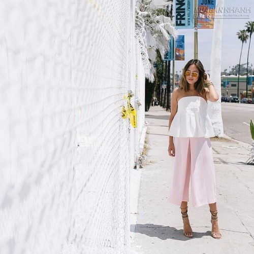 Phối đồ với quần trắng chưa bao giờ là dễ, phối đồ cùng culottes trắng còn phức tạp hơn. Bạn có thể chọn kiểu áo sát nách chun eo họa tiết như cô nàng này nhé.