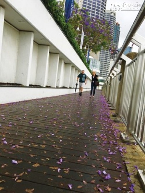 Chúng tôi chắc khó thể nào quên được con đường lát gỗ bên sông Brisbane và cảm giác bước đi khẽ khàng vì sợ giẫm nát những cánh hoa rơi. Hoa tím trên đầu, hoa tím dưới chân, một bên là những tòa nhà chọc trời đứng hiên ngang, một bên là những chiếc du thuyền đang neo đậu chờ khách để được vi vu. Không hề quá lời nếu nói rằng đây là con đường đẹp nhất, thơ mộng nhất mà chúng tôi đã từng đi qua trên đất Úc.