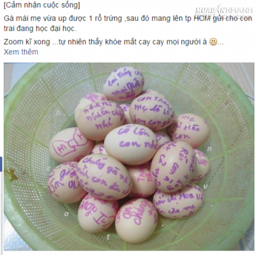 Dù những dòng nhắn ngắn ngủi viết vội còn nhiều lỗi chính tả, thế nhưng tình cảm của mẹ đã đong đầy trong từng nét bút. Đứa con nào nhận được rổ trứng gà này hẳn sẽ nghẹn ngào, xúc động và tự hào về mẹ lắm.
