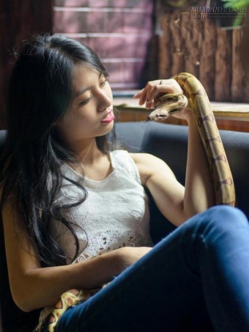 Với tình yêu động vật, cô chia sẻ: “Mỗi ngày mình thường dành khoảng 3 tiếng, thậm chí nhiều hơn để chơi và chăm sóc mấy em”. Hình ảnh Huyền Trang quấn rắn lên cơ thể khiến nhiều người e sợ. (Ảnh: Trí thức trẻ).