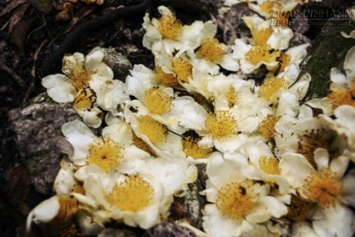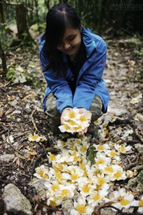 Những đoạn đường hoa sở rụng đầy lối như dòng suối trắng cánh hoa rơi, khiến con đường vào rừng thêm phần tiên cảnh, tươi nguyên. Hoa như người bạn dẫn lối cho kẻ lãng khách tìm về với rừng