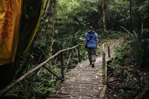 Đi giữa rừng trúc xanh non, có chút sương và dưới chân là lẻ bóng hoa sở