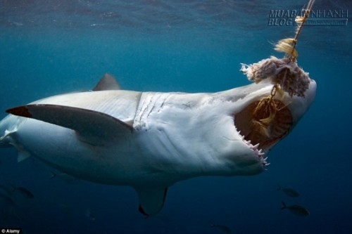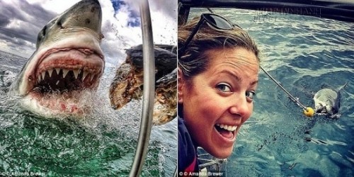 Khi đến đảo Mossel, du khách có thể ngắm cá mập do HLV Amanda Brewer(phải) thuần hóa ở khoảng cách chỉ vài mét. Amanda đang cho “quái vật” khổng lồ ăn từ trên tàu.