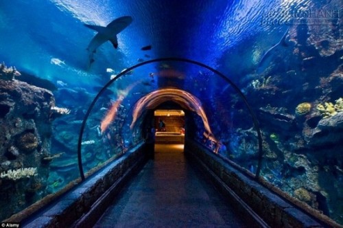 Ấn tượng nhất là mô hình tàu đắm khổng lồ, nơi du khách có thể ngắm cá mập theo một góc nhìn 360 độ khi đi bộ trong đường hầm trong suốt.