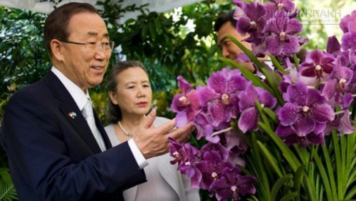 | Tổng thư ký Liên Hợp Quốc, ông Ban Ki-moon và vợ, bà Yoo Soon-taek, trước loài phong lan được đặt theo tên họ. |