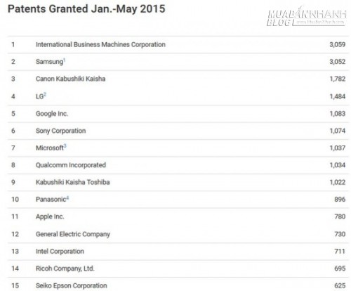 Tính từ thời điểm tháng 1 đến tháng 5 năm nay, hai công ty được cấp nhiều hồ sơ sáng chế nhất là IBM (3.059 hồ sơ) và Samsung (3.052 hồ sơ). Xếp sau hai gã khổng lồ này là Canon Kabushini Kaisha với 1.782 hồ sơ và LG với 1.484 hồ sơ. Trong khi đó công ty công nghệ nổi với việc chăm chỉ đầu tư cho các hoạt động nghiên cứu và phát triển là Google xếp ở vị trí thứ năm với 1.083 hồ sơ sáng chế được cấp. Cũng trong khoảng thời gian này,Apple được cấp 780 hồ sơ sáng chế, xếp ở vị trí thứ 11.
