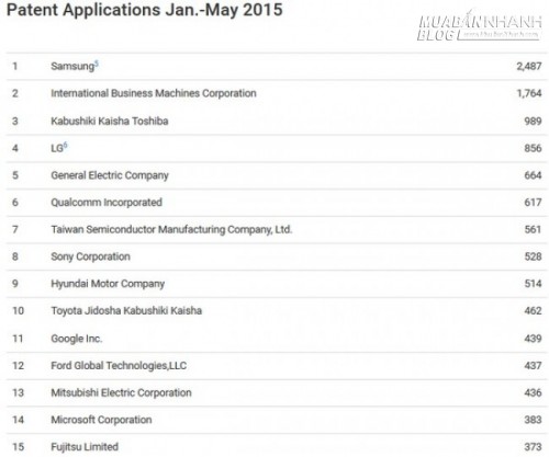 Top 15 công ty nộp nhiều hồ sơ sáng chế nhất (tính từ tháng 1 đến tháng 5, 2015).
