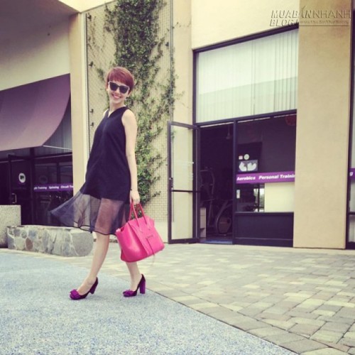 Tóc Tiên chọn váy đen pha vải lưới xuyên thấu trên tông đen để mix cùng túi xách và giày hồng đầy nữ tính.