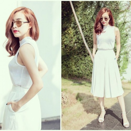 Trào lưu chọn sắc trắng và đen để chưng diện phát triển mạnh mẽ hơn bởi cách lăng xê khéo léo của nhiều người đẹp nổi tiếng. Tăng Thanh Hà cũng thể hiện việc mix trang phục cá tính với áo sát nách đen đi cùng quần in họa tiết trắng đen.