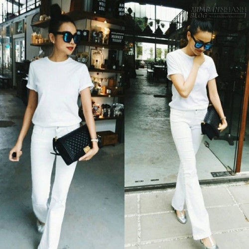 Hai tông màu hợp mốt được Thanh Hằng phối hợp nhẹ nhàng cùng nhau với áo thun, jeans ống suông trắng đi cùng túi Chanel da đen.