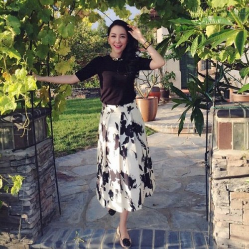 Linh Nga với hình ảnh đầy nữ tính khi chọn cho mình mẫu chân váy mini thiết kế đẹp mắt trên chất liệu vải in họa tiết trắng đen để phối cùng áo thun tay lửng tông màu đen.