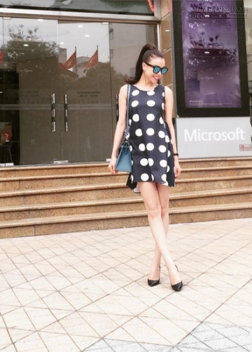 Trà Ngọc Hằng đơn giản với váy suông in họa tiết chấm bi trắng đen, giày cao gót đen và túi Hermes xanh dương.