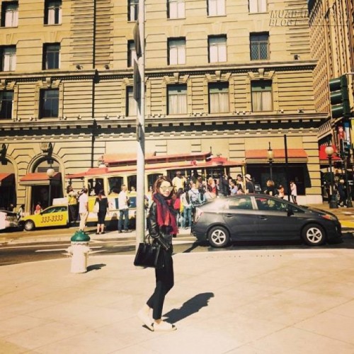 Hồ Ngọc Hà diện một "cây đen" với áo jacket da, quần skinny, túi xách tay khi đi dạo trên đất Mỹ trong dịp quảng bá DVD mới của mình.