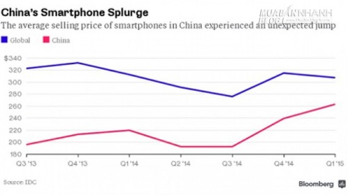 Thống kê cho thấy, giá bán trung bình của một chiếc điện thoại thông minh Trung Quốc đã tăng lên đáng kể, chỉ trong vòng vài tháng gần đây. Theo biểu đồ minh họa của Bloomberg, thời điểm quý III/2014 giá trung bình là 192 USD/chiếc thì đến quý IV/2014 tăng thành 239 USD, sau đó lên mốc 263 USD vào quý đầu năm nay. Các nhà phân tích cho rằng, đây là bước nhảy giá bất thường, đặc biệt khi đối chiếu vào các mốc thời gian.